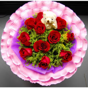 11枝紅玫瑰,黃鶯點(diǎn)綴,內(nèi)襯紫色綿紙,外用粉色裙邊紙圓形包裝,附送一只可愛小公仔