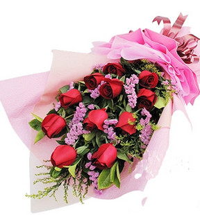 花材:紅玫瑰11枝,配材豐滿,淺色棉紙內襯,粉色手揉紙多層包裝,蝴蝶結束扎單面花束。