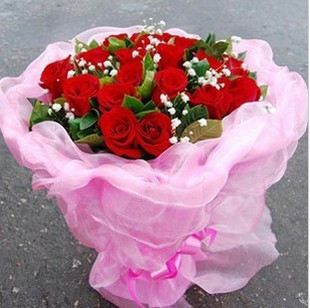 [包 裝]:19朵紅玫瑰,點(diǎn)綴配材.粉色圓形裙紙+粉紗精美包裝,配蝴蝶結(jié)束扎。