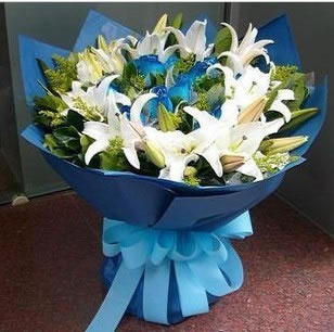[材 料]:花束.12朵藍(lán)玫瑰+9支香水百合,點(diǎn)綴配材. [包 裝]:藍(lán)皺紋紙圓形精美包裝,配蝴蝶結(jié)束扎。