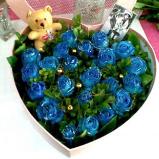 商品簡介:22支藍色妖姬,綠葉搭配,小熊一個,心形禮盒精美包裝