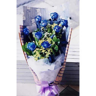 商品簡介:11支藍色妖姬,黃鶯綠葉,淡色網紗內襯,淡紫色單面包裝,精美蝴蝶結束扎