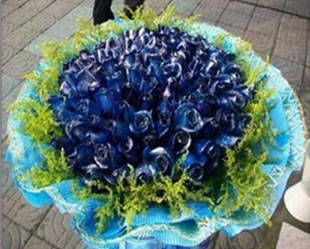 材料包裝: 99朵藍色妖姬,外圍黃鶯一圈,高檔包裝紙