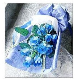 商品簡介:9枝A級昆明藍色妖姬,配綠葉 韓式單面包裝:內襯白色棉紙,外層紫色棉紙扇形包裝,紫色花結
