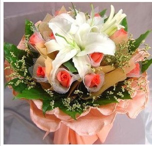 | 材料包裝: | 11枝粉玫瑰(白色網紗+香檳色棉紙獨立包裝),3朵多頭白色百合,水晶草間插,綠葉外圍。香檳色皺紋卷邊紙圓形包裝,法式花結裝飾