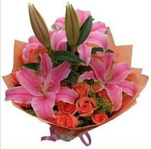 商品簡(jiǎn)介:19枝粉玫瑰,3多粉色百合花束