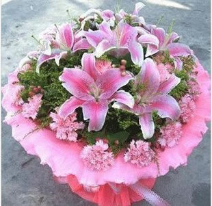 6朵粉百合,21支粉色康乃馨,圓形粉色卷邊紙包裝