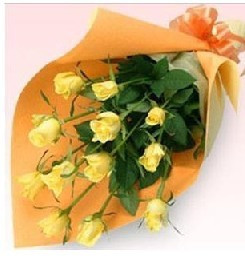 商品簡介:花束:12枝帶葉黃玫瑰,桔黃色皺紋紙,絲帶束扎