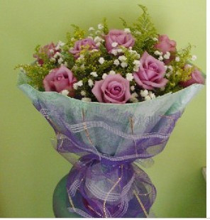 [材 料]:花束,11朵紫玫瑰,點綴滿天星、黃鶯. [包 裝]:紫網圓形精美包裝,配蝴蝶結束扎。
