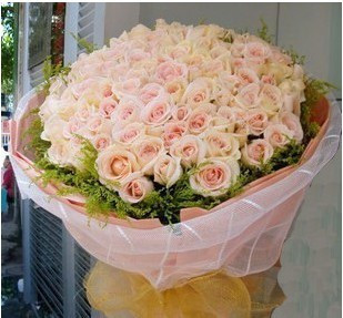 商品簡介:[花材] 99朵香檳玫瑰,黃鶯點綴豐滿。 [包裝] 淡粉色皺紋紙平角圓形包裝,外層韓紗修飾,配蝴蝶節束扎。