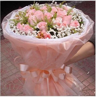 材料包裝: [材 料]:花束,22朵粉玫瑰,點綴黃鶯、滿天星. [包 裝]:粉皺紋紙圓形精美包裝,配蝴蝶結束扎。
