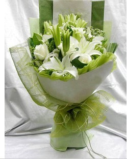 商品簡介:2支白玫瑰,7支白百合,配葉配花 包裝:按照圖片精美包裝