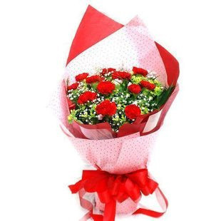 商品簡(jiǎn)介:12枝紅色康乃馨,滿天星+黃鶯點(diǎn)綴,紅色和粉色包裝紙單面包裝