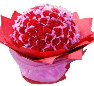 商品簡介:99枝紅色康乃馨,玫紅色綿紙單個包裝,大紅色皺紋紙圓形尖角包裝。玫紅色包裝紙束腰.