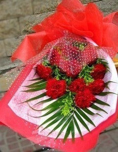 材料包裝: [花 材]:花束,9朵紅色康乃馨,點綴配材。 [包 裝]:紅皺紋紙扇形精美包裝,配蝴蝶結束扎。
