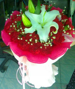 生日快樂 [材 料]:11枝紅康乃馨+1支白香水百合,點綴配材。 [包 裝]:卷邊紙圓形精美包裝,配蝴蝶結束扎。