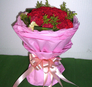 [材 料]:花束.33朵紅色康乃馨,點綴配材. [包 裝]:粉皺紋紙圓形精美包裝,配蝴蝶結束扎。