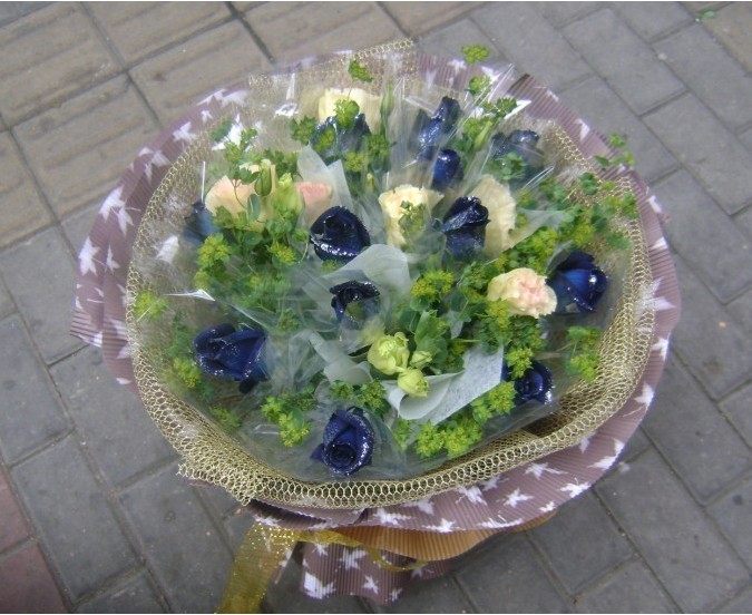 商品簡介:藍玫瑰11枝 桔梗 綠葉內襯 玻璃紙 高檔瓦倫紙外圍 精美蝴蝶結