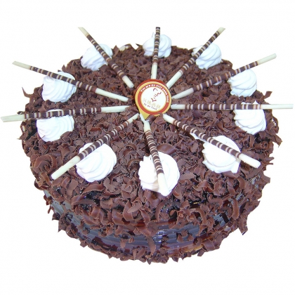 圓形黑森林蛋糕,白色奶油花、巧克力棒裝飾。