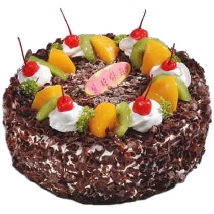 相關花語: 圓形黑森林蛋糕,時令水果裝飾,白色奶油點綴紅櫻桃