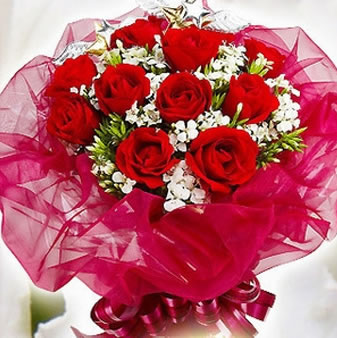 【花材】:11支紅玫瑰,滿天星綠葉搭配。【包裝】;大紅色網紗包裝。