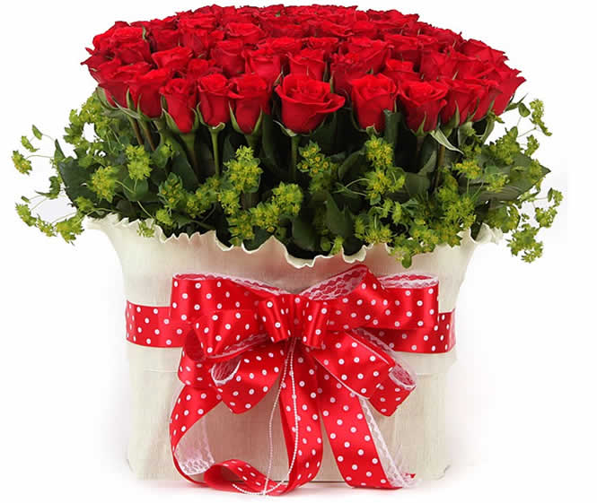 材料包裝: 99朵公色昆明玫瑰 也上黃金圍邊搭配 桶籃底座,粉色卷邊紙包裝 紅色大花結裝飾