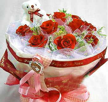 商品簡介:9支紅玫瑰加黃鶯搭配 加一只可愛熊 高檔皺紋紙雙層包裝