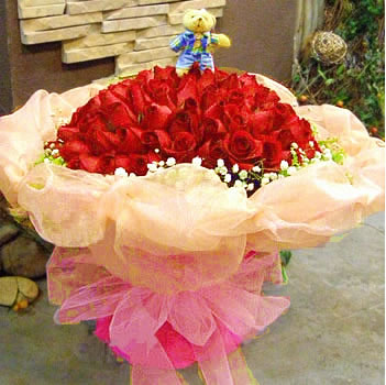 商品簡介:99支紅玫瑰+小熊 香檳色紗精美包裝 粉紅色大蝴蝶結裝飾