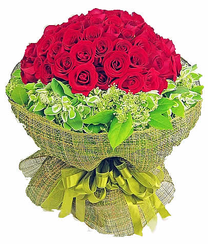 商品簡介:99支紅玫瑰加梔子葉圍圈搭配,網紗包裝同色系蝴蝶結