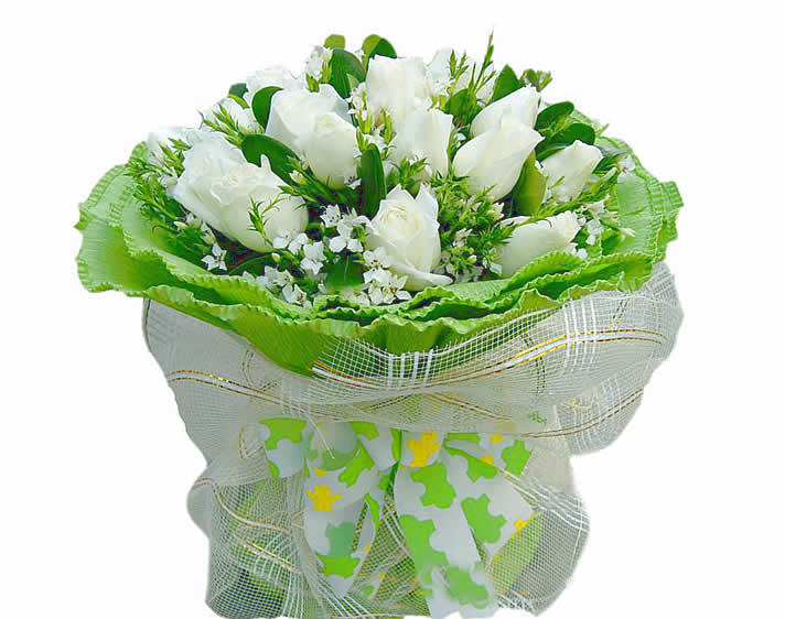 商品簡介:16支白玫瑰加綠葉滿天星搭配圓形包裝 綠色卷邊紙包裝,外加白色網(wǎng)紗 同色系蝴蝶結(jié)