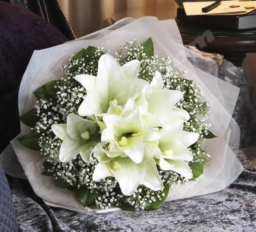 商品簡介:6支鐵炮百合,漫天星豐滿圍邊,八角葉搭配 多層粉色棉紙包裝