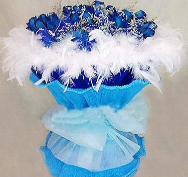 33支藍(lán)色妖姬 加白色羽毛圍邊搭配,藍(lán)色高檔卷邊紙包裝,細(xì)紗蝴蝶結(jié)