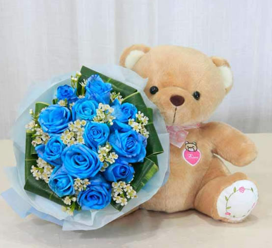 12支藍(lán)色妖姬 加綠葉搭配 小雛菊豐滿(或其他同類型配花) 淡藍(lán)色皺紋紙包裝 中等大小小熊一個(gè)
