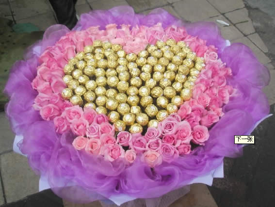 商品簡(jiǎn)介:99顆巧克力心形外圍99朵紫玫瑰 紫色細(xì)紗包裝