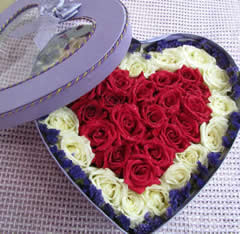 商品簡介:精選19枝A級昆明紅玫瑰+19枝白玫瑰 紫色勿忘我外圍,心型禮盒精美包裝。