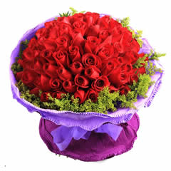 商品簡介:99枝紅玫瑰,黃鶯圍繞玫瑰,淡紫色裙邊紙圓形包裝