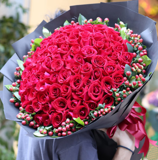 99枝紅玫瑰,相思豆圍邊搭配,黑色包裝