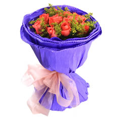 商品簡介:11枝粉玫瑰,黃英配材相襯,紫色皺紋紙 圓形包裝