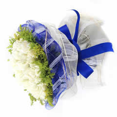 商品簡介:33枝白色玫瑰,藍色網紗圓形包裝,白色網紗下托,淡藍色蝴蝶結。