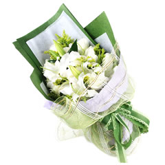 白玫瑰11支 白色香水百合2支 黃英與綠葉相襯;白色 綠色揉紙 綠色紗網(wǎng)。