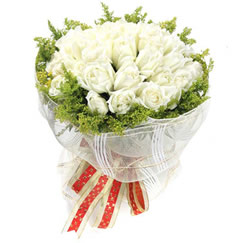 商品簡介:21枝白玫瑰+黃鶯,淡色紗網束裹,金色絲帶束扎。