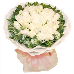 商品簡介:33朵白玫瑰,綠葉圍繞,粉色包裝紙圓形包裝