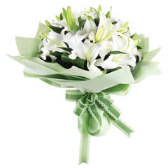 商品簡介:多頭白色香水百合9大枝,淡綠色皺紋紙,圓形花束型花束,絲帶束扎。