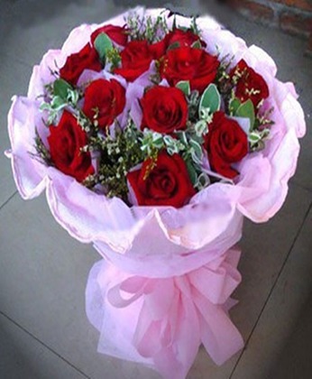 商品簡介:紅玫瑰11枝 水晶草(配花) 葉上花(配花)粉色卷邊紙包圓形