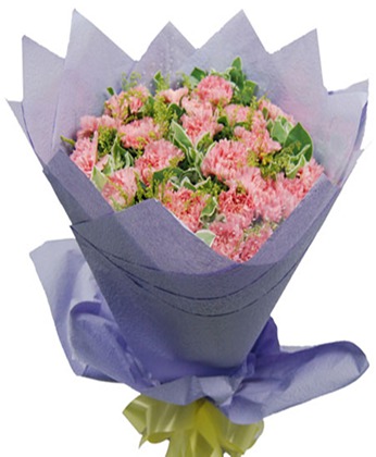 商品簡介:粉色康乃馨20枝 黃鶯(配花)紫色皺紋紙包圓形