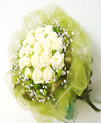 白玫瑰19枝 滿天星 綠葉 商品包裝:細紗內(nèi)襯,卷邊紙圓形包裝