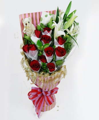 商品簡介:紅玫瑰12枝 白色多頭百合2枝 梔子葉 1只小熊坐在花間 商品包裝:粉色皺紋紙及淺色網紗