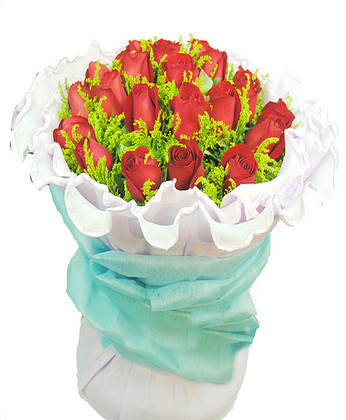 紅玫瑰21枝 黃鶯 商品包裝:淺色卷邊紙包圓形,淺色蝴蝶結