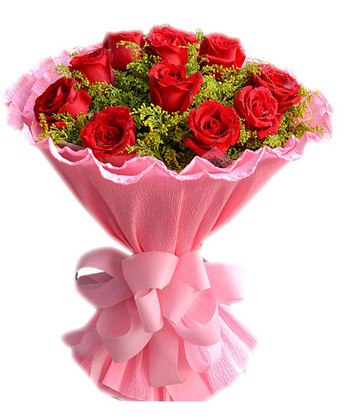 商品簡介:紅玫瑰11枝 黃鶯 商品包裝:粉色卷邊紙圓形包裝