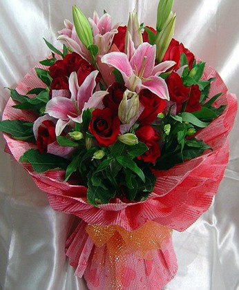 商品簡介:粉色多頭百合2枝 紅玫瑰19枝 綠葉 水晶花 商品包裝:卷紙圓形包裝